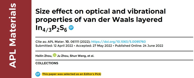 在另一项工作中,司机社 游陆-方亮课题组和雎胜课题组开展合作,研究了二维金属磷硫化物In4/3P2S6的光学和晶格振动的尺寸效应,相关工作以“Size effect on optical and vibrational properties of van der Waals layered In4/3P2S6”为题发表在应用物理知名期刊APL Materials上,并被选为Editor’s Pick。物理司机社 硕士研究生周海林和博士研究生周琚、王顺为文章的共同第一作者,雎胜教授、方亮教授和游陆教授为共同通讯作者。