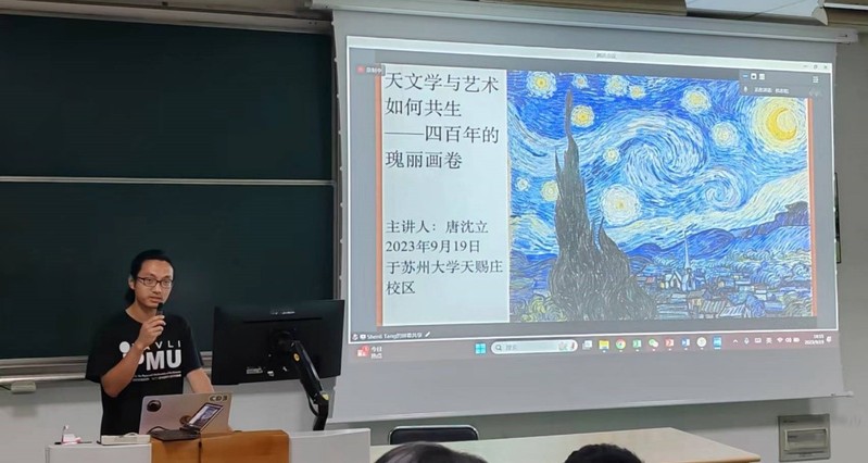 在讲座中,唐沈立博士通过生动的案例和精美的图示,向在场师生展示了星辰与艺术之间的共通之处。他还介绍了许多融合了天文学和艺术的作品,让人们感受到宇宙的无限魅力。他指出,艺术家们以科学家们的预测和自身想象力为依据,通过绘画将未来展现给世人,他们如同科学先驱般在引领人类文明的前进。到了二战前期,随着空间科学的兴起,现代天文艺术崭露头角。现代天文学数据经过艺术加工,使其成为了一门融合严谨加工算法的艺术。随着数字时代的到来,这门艺术将变得更加精致,让人类的宇宙梦想飞得更高更远。