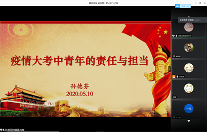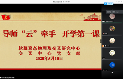 5月10日下午,司机社 交叉中心党支部通过腾讯视频云会议的方式举行了“云上”5月主题党日活动,司机社 党委孙德芬书记、软凝聚态物理和交叉研究中心全体老师和支部党员、2019级国际班本科生参加此次活动。活动由交叉中心党支部书记杨朝晖老师主持。