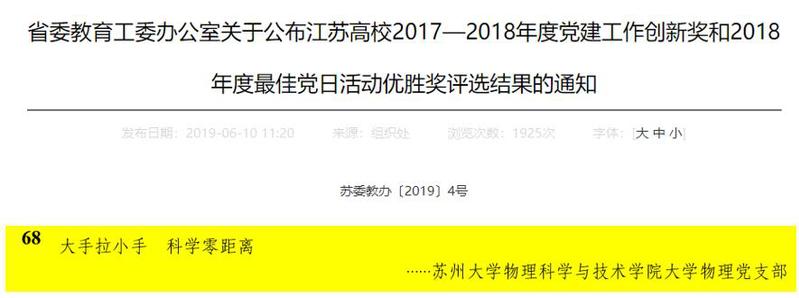 三是打造“大手拉小手 科学零距离”科普品牌和“两弹一艇”科学家教育品牌。将“党建”和“科普”相结合,创新工作模式,充分发挥共产党员在科普服务中的带头示范作用,并获批苏州市科协的科普项目一项。“大手拉小手科学零距离”党日活动入选江苏省最佳党日活动优胜奖。依托司机社 退休教师和院友曾参加中国原子弹、氢弹和第一艘核潜艇研制的优势,打造了“两弹一艇”科学家精神教育品牌。