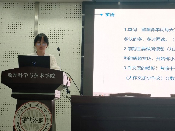 学习方面,首位上台的韩雨学姐分科目讲述了自己的复习方法:数学和物理注重刷题和知识点的总结,英语注重词汇量和做题技巧的积累,政治则应在熟记要点的同时保持对时事新闻等的熟悉度。正所谓“金需百炼,失不轻发”,刷题、背诵之类重复性的劳动确是保证熟练度重要的过程,仅仅观阅一些课程或书籍明显是不够的。学习中应避免“自我感动”,注意有效学习时间,保证学习质量。当然,努力需注意方向,多位学长也强调了学习方法的重要性。孟海霞学姐表示要有自己寻找学习资源的能力,刘佳楠学姐则强调应安排及时的复习,同时重视“输出”,学会知识的灵活运用。但同时,魏落学长也提醒道,那些网络平台上“高效”的备考方法未必是合理的,适合自己、能够坚持下去的学习方法才是合适的选择。