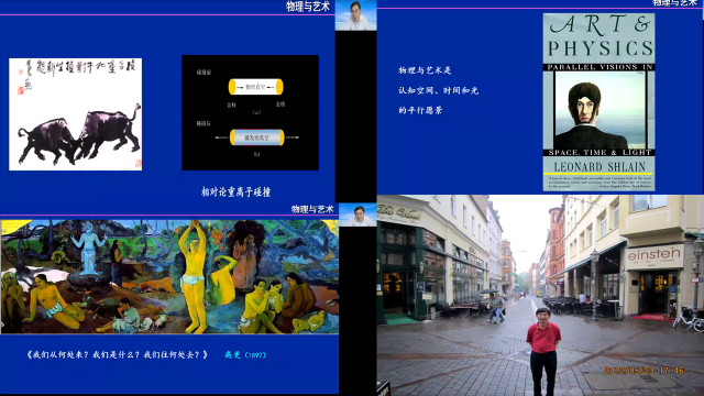 施校长强调,我们之所以要重视美育教育,是因为德智体美劳五育并举是我们国家发展的重要战略,是对人才培养的核心要求,也是综合素养的集中体现。施校长从丰富的教学经验出发,立足于美育是与立德树人、素质教育、创新能力紧密相联的角度对美育的感受进行概括:美育是培根铸魂的工作;美育是立德树人的载体;美育是创新培养的基础。接着施校长借清华科技园门口的两牛对撞雕塑实际体现的是相对论重离子碰撞的物理意义的实例来说明科学与艺术便是实现自己与灵魂沟通的有效途径,指出物理与艺术是认知空间、时间和光的平行愿景。在展示编写的《物理与艺术》教材时,指出理想愿景即为希望能在科艺交融的素质和创新思维能力提升中,潜移默化地培养学生正确的宇宙观、世界观和人生观。施校长更是从专业全面的角度给出艺术和物理的不同点和共同点。二者表面对立,但它们最重要的共同点却是二者皆面对同一个自然,均是人类尝试认识真理的手段。举例高更所做的画作《我们从何处来?我们是什么?我们往何处去?》画的是人生历程,而实际这样的人生历程却也体现着科学的基本问题,所以施校长指出科学与艺术的内在联系便是:创造力。最后施校长以一张站在两家名为爱因斯坦和达芬奇的餐馆中间的照片收尾,总结所谓科学家,即是表现宇宙真实存在的艺术家;艺术家,即是表现情感真实存在的科学家。