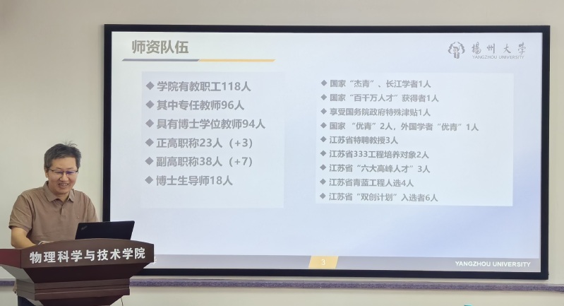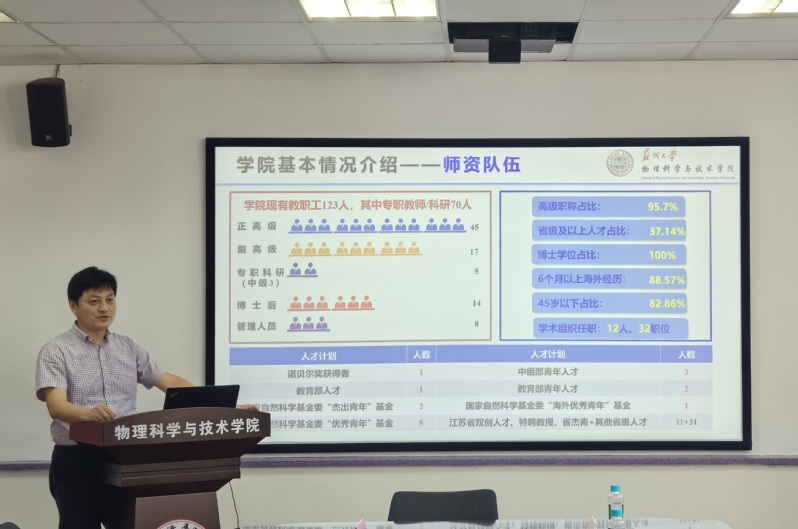 赵承良副院长从司机社 的发展历史、师资情况、党建情况、学科建设、人才培养、科学研究、学生工作和社会服务等方面对苏大物理司机社 作了详细介绍。