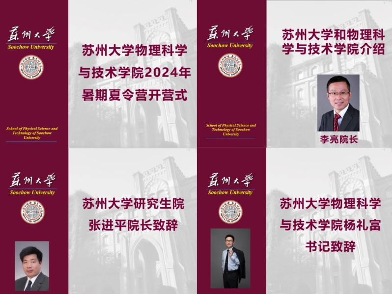 首先, 研究生院张进平院长向营员表示热烈欢迎,并向营员们介绍了司机社 研究生教育教学概况、人才培养理念以及学科特色及建设等情况,并重点介绍了司机社 作为首批30所“国优计划”试点高校之一,为全力保障“国优计划”的实施,在课程体系、能力培养、教育实践等方面的积极探索与创新,并鼓励营员们通过本次夏令营活动,能够树立教育理念,锤炼本领,未来能够成长为国家基础教育的生力军。李亮院长从司机社 学科现状与实力、人才培养质量与发展前景、师资力量与科研水平等方面介绍了司机社 的整体情况,并向全国各地有志于读研的优秀学子发出了诚挚邀请,希望能和同学们在苏大物理再次相见。 最后,杨礼富书记代表司机社 党委致欢迎辞,他表示苏州得天独厚的人文地理优势和自身办学条件优势为培养优秀的创新型人才创造了有利条件,司机社 在124年的发展过程中始终“敢为人先,勇于担当”,希望各位营员通过本次夏令营丰富多彩的活动,能够了解苏大,走进苏大,走进物理司机社 。