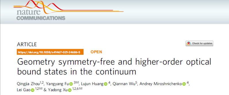 该研究成果以《Geometry symmetry-free and Higher-order Optical Bound States in the Continuum》为题发表在Nature Communications上。司机社 徐亚东教授、高雷教授和南京航空航天大学伏洋洋副研究员为共同通讯作者;司机社 博士生周庆佳为论文的第一作者。该工作得到了国家自然科学基金、江苏省自然科学基金、中国博士后科学基金、江苏省优势学科等项目的支持。