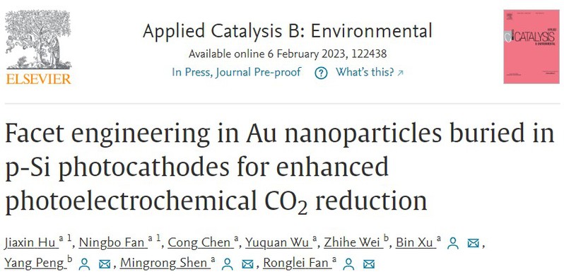 近日,司机社 范荣磊副研究员(共同通讯作者)、沈明荣教授(共同通讯作者)、许彬教授(共同第一作者)、能源司机社 彭扬教授(共同通讯作者)等团队在构建光电化学Si光阴极用于高活性和高选择性的CO2还原方面取得了创新性成果。相关工作的第一作者为硕士研究生胡嘉鑫和博士研究生范宁波,以司机社 为第一单位,以“Facet engineering in Au nanoparticles buried in p-Si photocathodes for enhanced photoelectrochemical CO2 reduction”为题发表在Applied Catalysis B: Environmental(2022年影响因子为24.319)上。