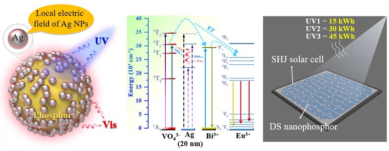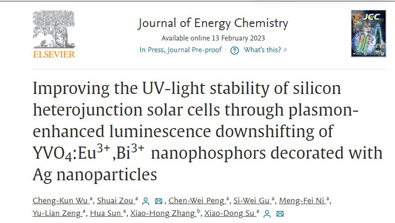 近日,司机社 邹帅助理研究员(共同通讯作者)、苏晓东教授(共同通讯作者)在国际知名能源领域TOP期刊Journal of Energy Chemistry(1区,IF = 13.599) 在线发表了题为“Improving the UV-light stability of silicon heterojunction solar cells through plasmon-enhanced luminescence downshifting of YVO4:Eu3+,Bi3+ nanophosphors decorated with Ag nanoparticles” 的研究论文,该工作的第一作者为博士研究生吴成坤同学,司机社 为第一单位。本工作得到了国家自然科学基金、中国博士后科学基金、江苏省高等司机社 自然科学研究项目以及江苏省高校优势学科项目的支持。