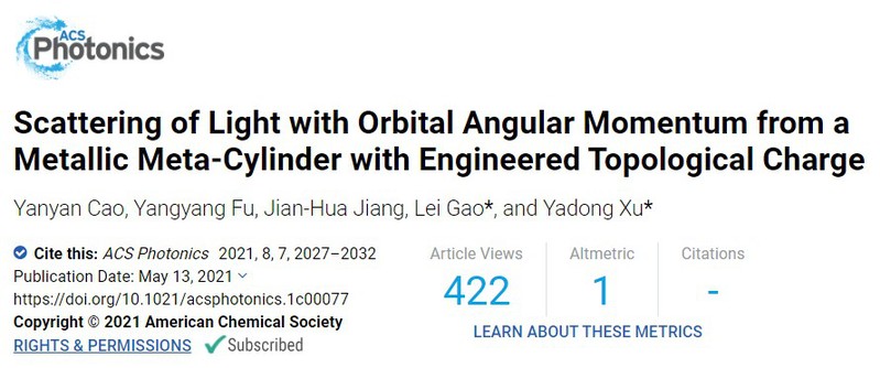研究成果以《Scattering of light with orbital angular momentum from a metallic meta-cylinder with engineered topological charge》为题发表在ACS Photonics上并且入选Supplementary Cover。博士后曹燕燕为论文的第一作者。该工作得到了国家自然科学基金、江苏省自然科学基金、中国博士后科学基金等项目的支持。